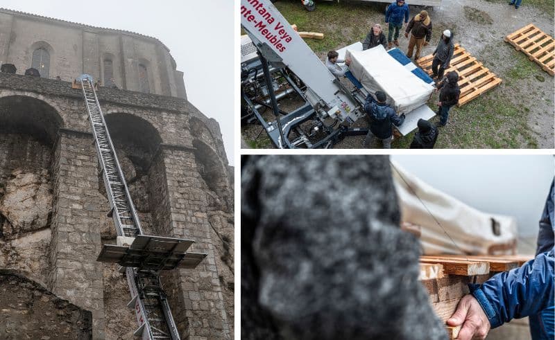 Pour permettre son ascension hors norme jusqu’à la chapelle, la maquette de 1,8m x 1,8m a été réalisée en deux parties. Elle est fabriquée sur une structure métallique.Le rendu monochrome est volontairement intemporel. Un important travail de modélisation des détails contrebalance ce choix colorimétrique.